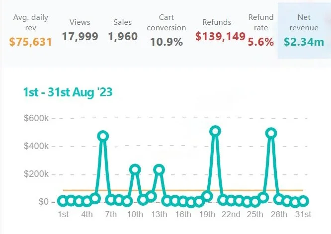 1112 sales of a $500 course (-111 refunds) = $500,500 generated (with a ROAS of 4,14)
